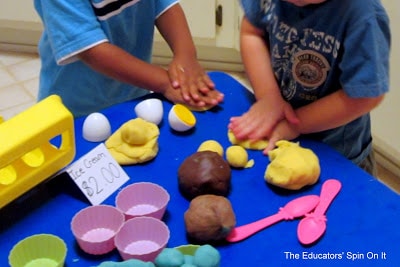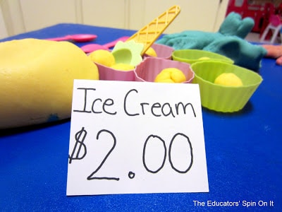 Then he got a piece of paper and handed me a marker and said, “Ice cream 2 dollars.” Don’t you just love this kid? I know I am biased, but he does have great ideas. It is always good to include writing and math to your pretend play. This environmental print develops early reading skills!