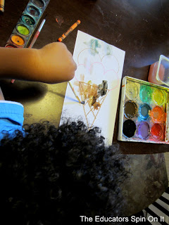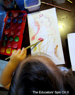 I also set up a watercolor painting station. I had the moms help draw an ice cream form with crayons and encourage their children to help, then paint over the ice cream shape for a crayon resist painting.