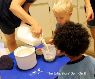 Then, just because we love cooking with kids, we made our own ice cream. The kids all helped pour the ingredients into the ice cream maker. I used a smaller measuring cup for my sugar so that the kids could all have a couple of turns adding ingredients.