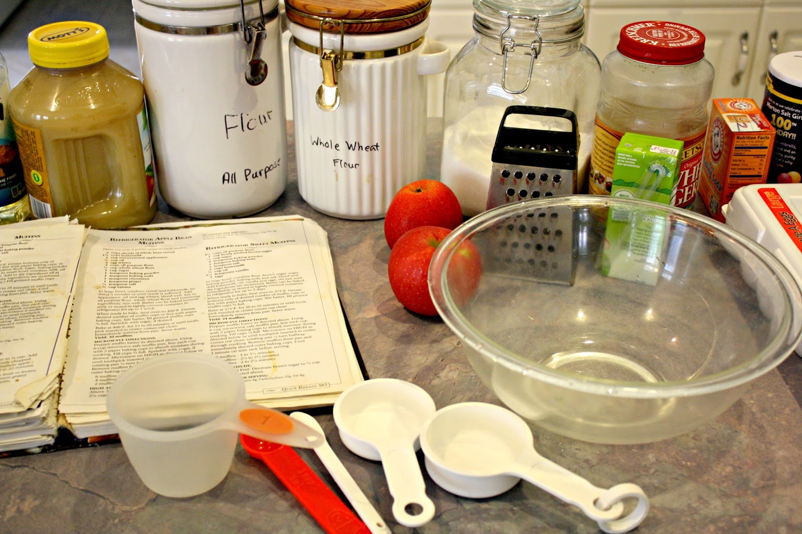Here is a picture of ours from yesterday. It’s nothing fancy, but it works. I re-use the same bowl and measuring spoons, washing them out between batches.