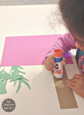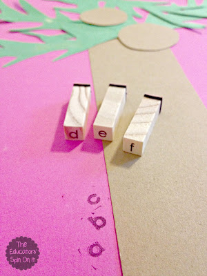 One a light colored sheet of paper have your child glue a brown stem for the trunk of the palm tree and create 3 to 5 green palm tree branches to glue on top of the trunk. Once the glue is draw encourage your child to stamp with ABC stamps.