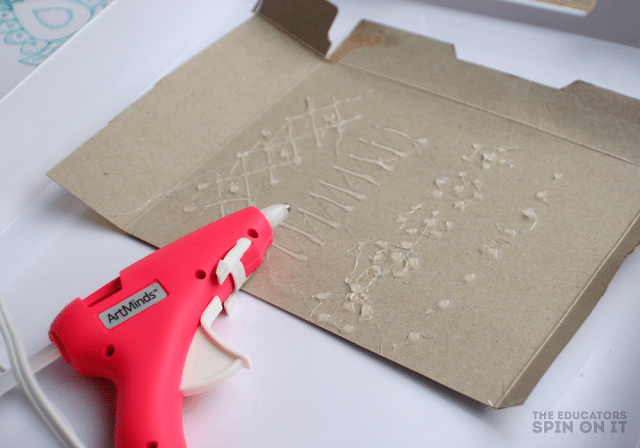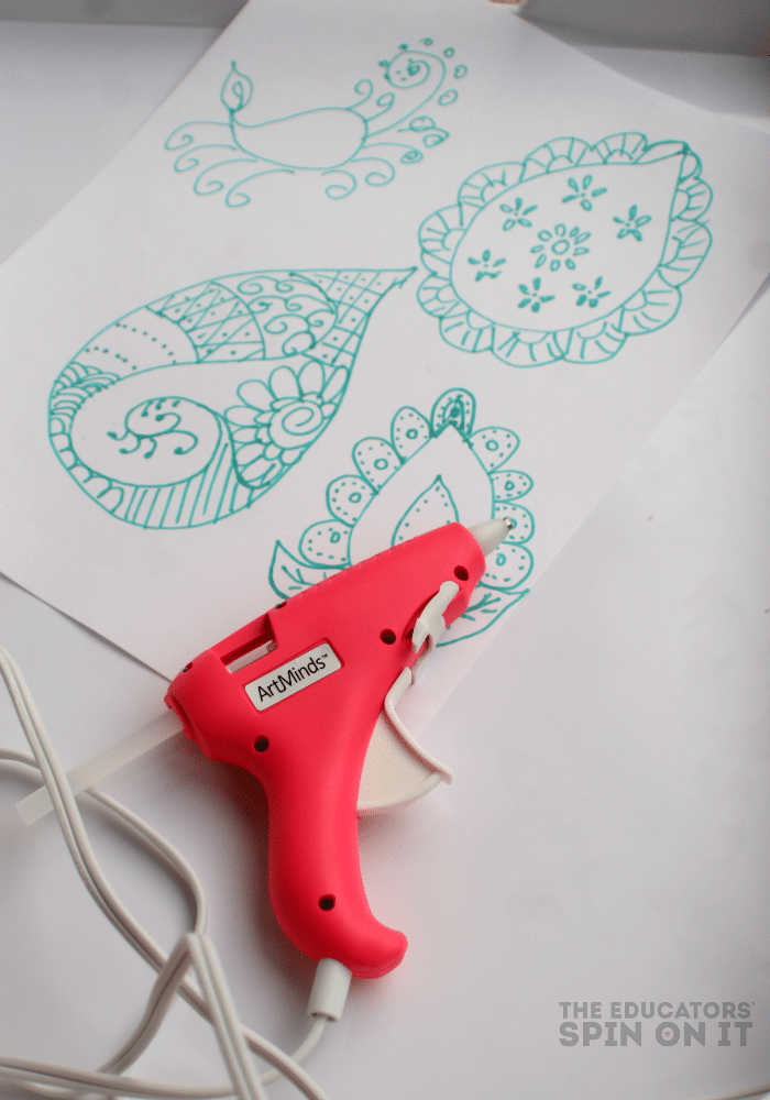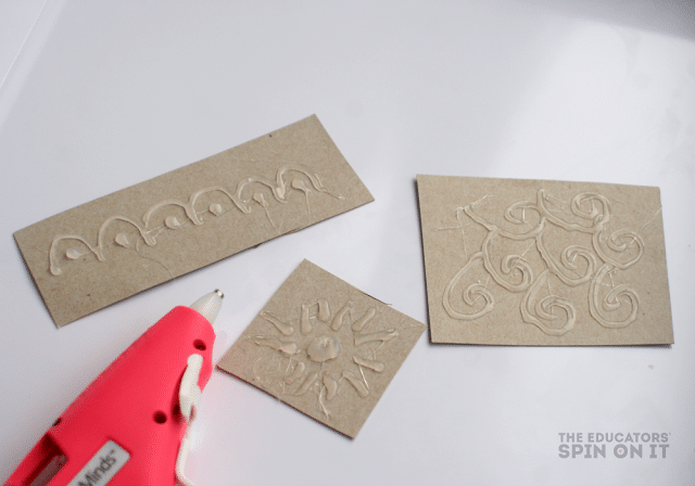 Then the adults will trace the design with hot glue gun and allow to cool. Once cool cut out stamps to use for projects.