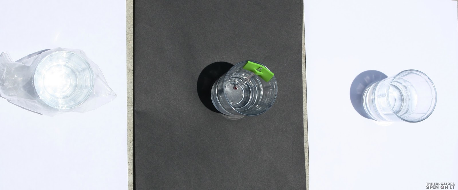 2. Measure the water temperature and set one cup on each paper. Cover one of the glasses on white paper with plastic.