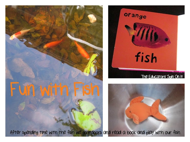 We have found fish, squirrels, birds, frogs, ladybugs, and so those are the toys we are exploring and playing with right now. Don’t feel like you have to own all of these things… sometimes playgroups are a great way to exchange a concept. I’m waiting for a friend’s zoo animals to arrive at my house any day! Can’t wait!