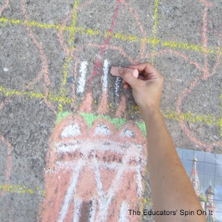 For this lesson, I wanted to incorporate art, math, geography, and FUN. Inspired by a local sidewalk chalk art festival, the kids and I did a little research on the famous Russian buildings.