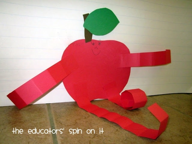 We created an apple art project by creating legs and arms by folding them accordion style and then attaching them with glue. Then they personalized their apple with a face.
