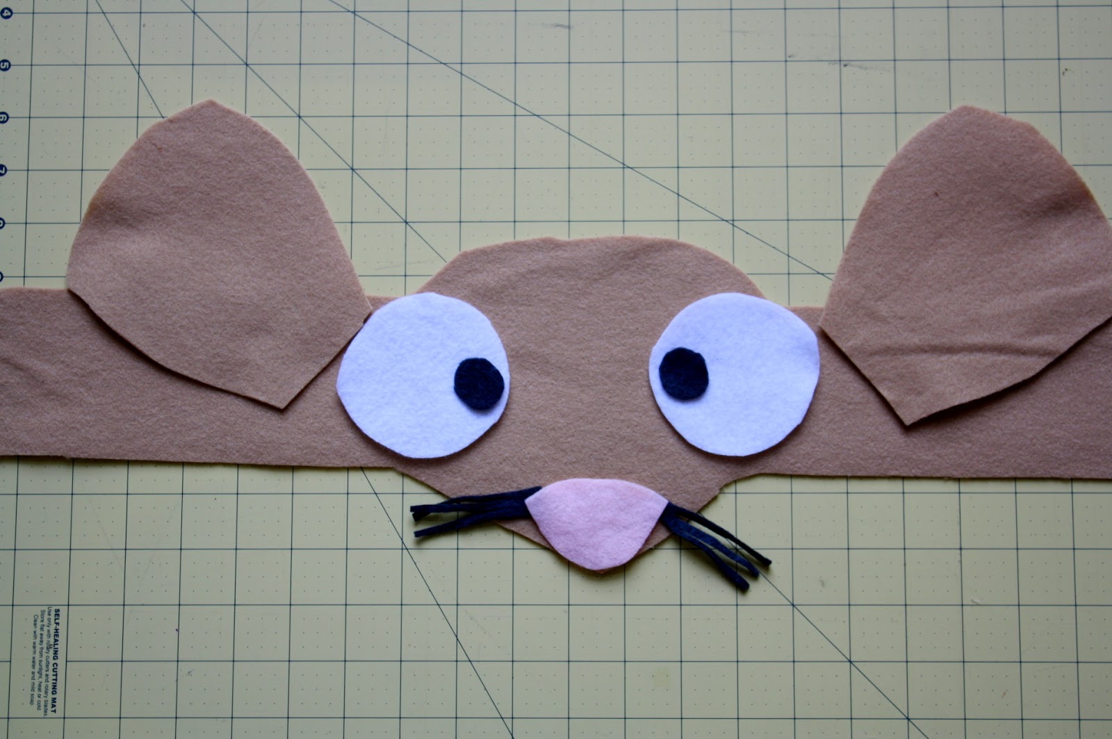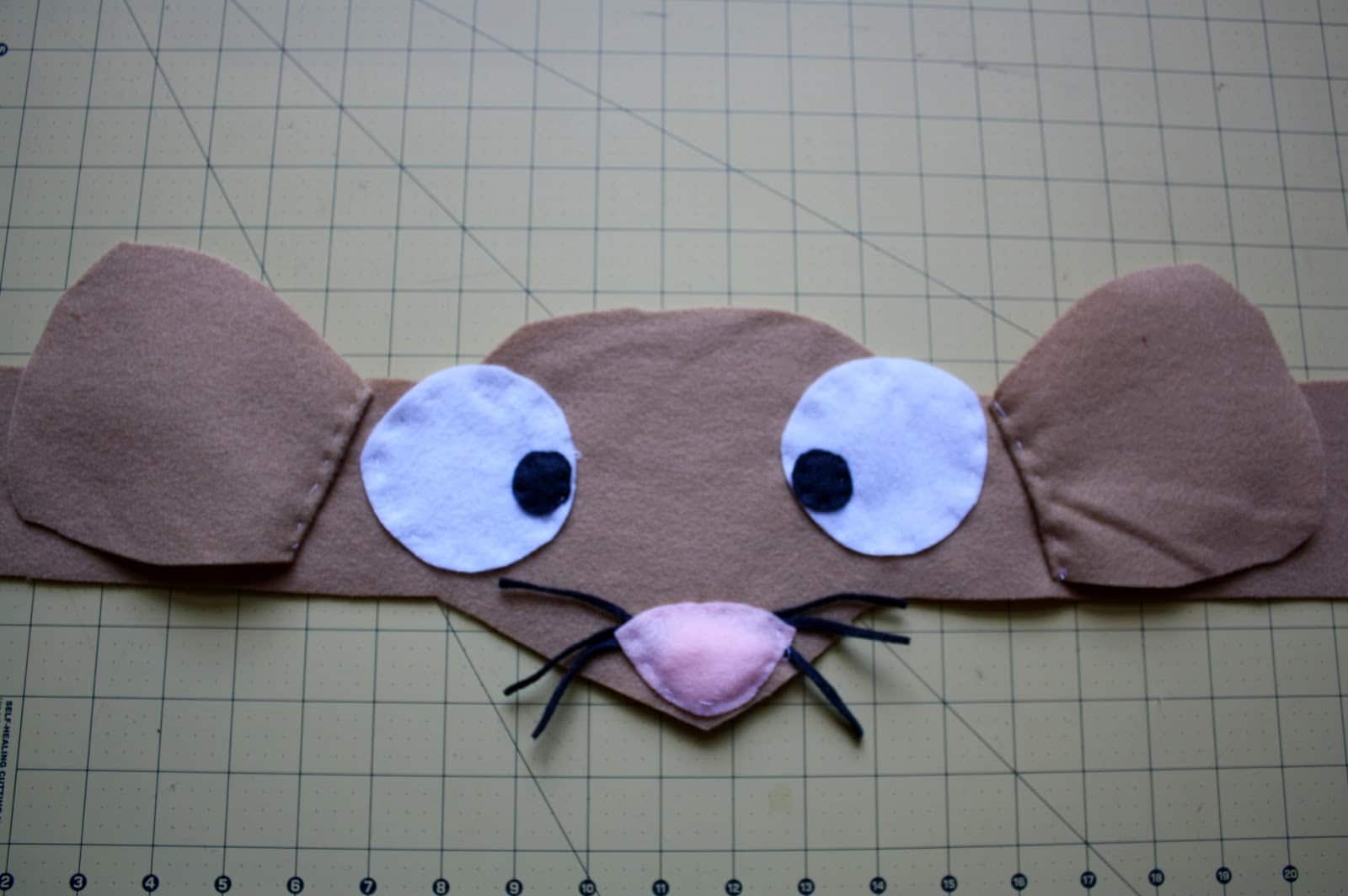 3. Using a straight stitch, attach the mouse features to the main headband piece. We added a little cotton batting under the nose to make it puff up a little bit.