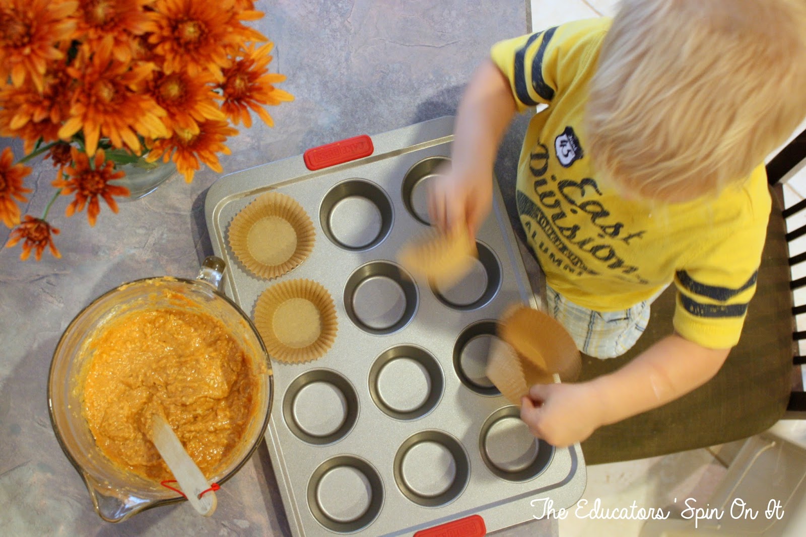 While they mix, I quick put the ingredients back in the pantry and set up the muffin tins and liners. This is my little bakers FAVORITE job to do – set and re-set all the muffin liners in place.