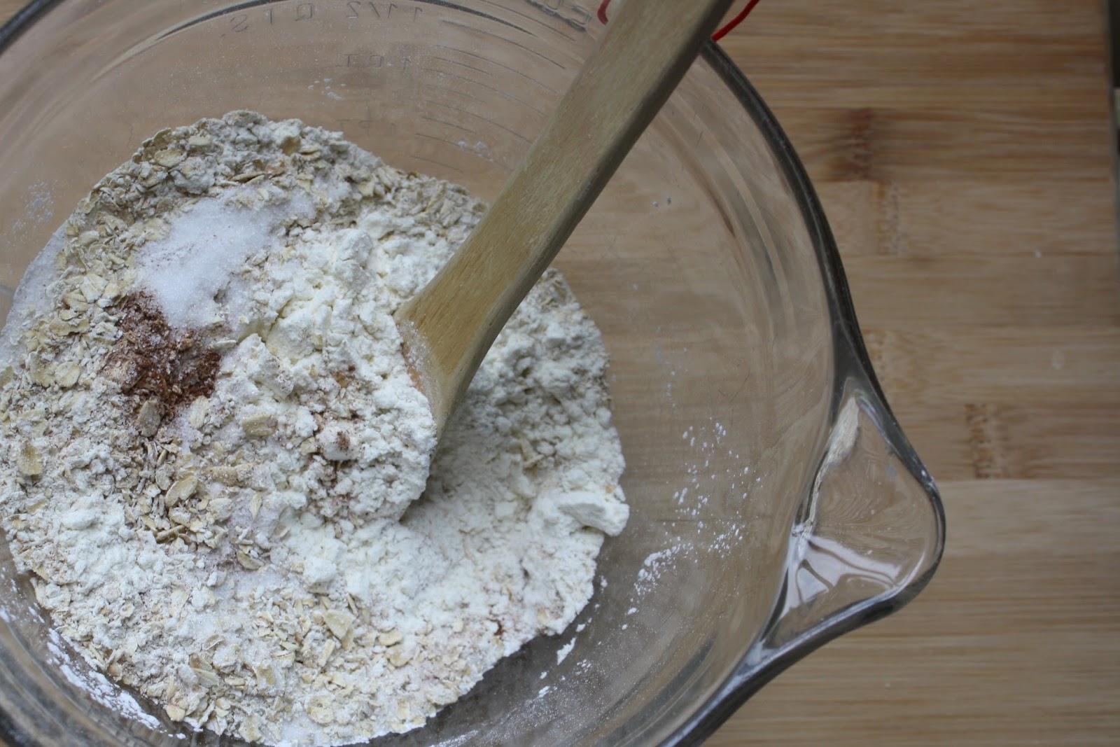 2. Pile on the wet ingredients. Mix those together first, then mix with the dry. “Technically” you should mix them in another bowl, but I dislike doing dishes. So I pile them on this way. Mix as little as possible, just until everything is moist.
