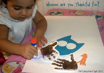 Once we gathered our supplies we made several brown hand prints because we planned to make cards for family members. {Sorry no photos we were too busy covered in brown paint, keeping baby wipes close by are a big help when making hand prints.}