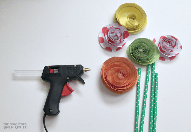 7. Once glue is cool on each flower attach to the paper straw using the hot glue.