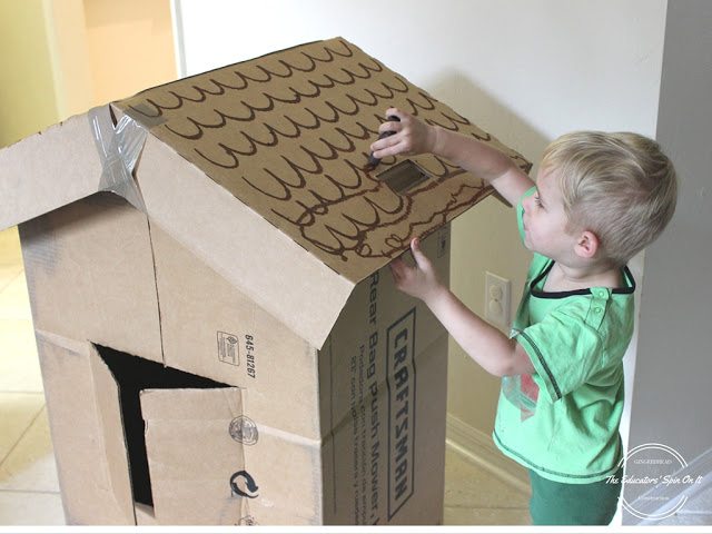 1. Talk about the gingerbread house design with your child using the cardboard box.