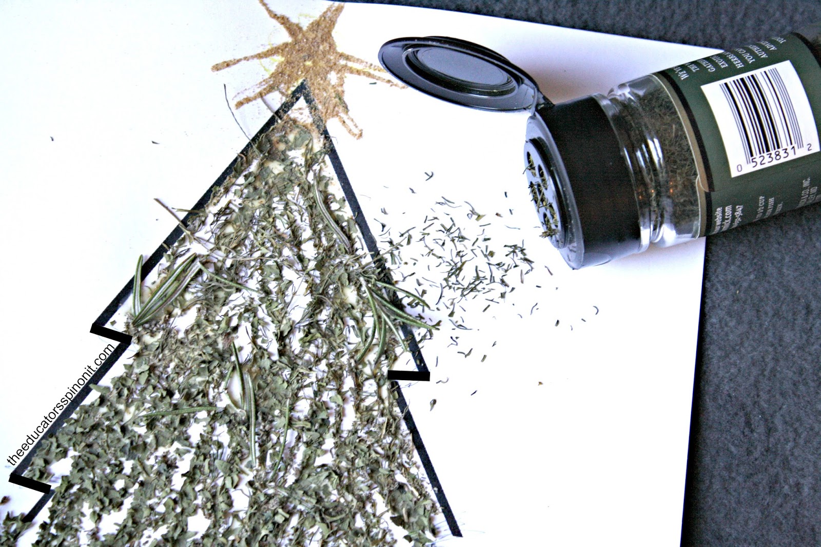 Christmas is the most wonderful time of the year for sights and smells. From the neighborhood lights at night to the smells of cookies baking in the oven. This Preschool Christmas Tree craft idea combines the sense of smell, sight, and touch using dried seasonings such as oregano, dill, rosemary, parsley, and cilantro.