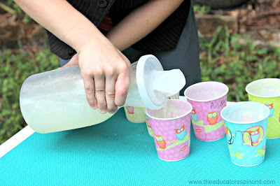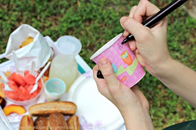 As I said earlier, my 9 year old helped fill the tray to take outside with us. I also bring the paper cups together with a pitcher of lemonade. The kids help label the cups and pour the beverages. This cuts down on waste at big gatherings and lets them practice the life skill of pouring (which uses fine motor skills) and independence.
