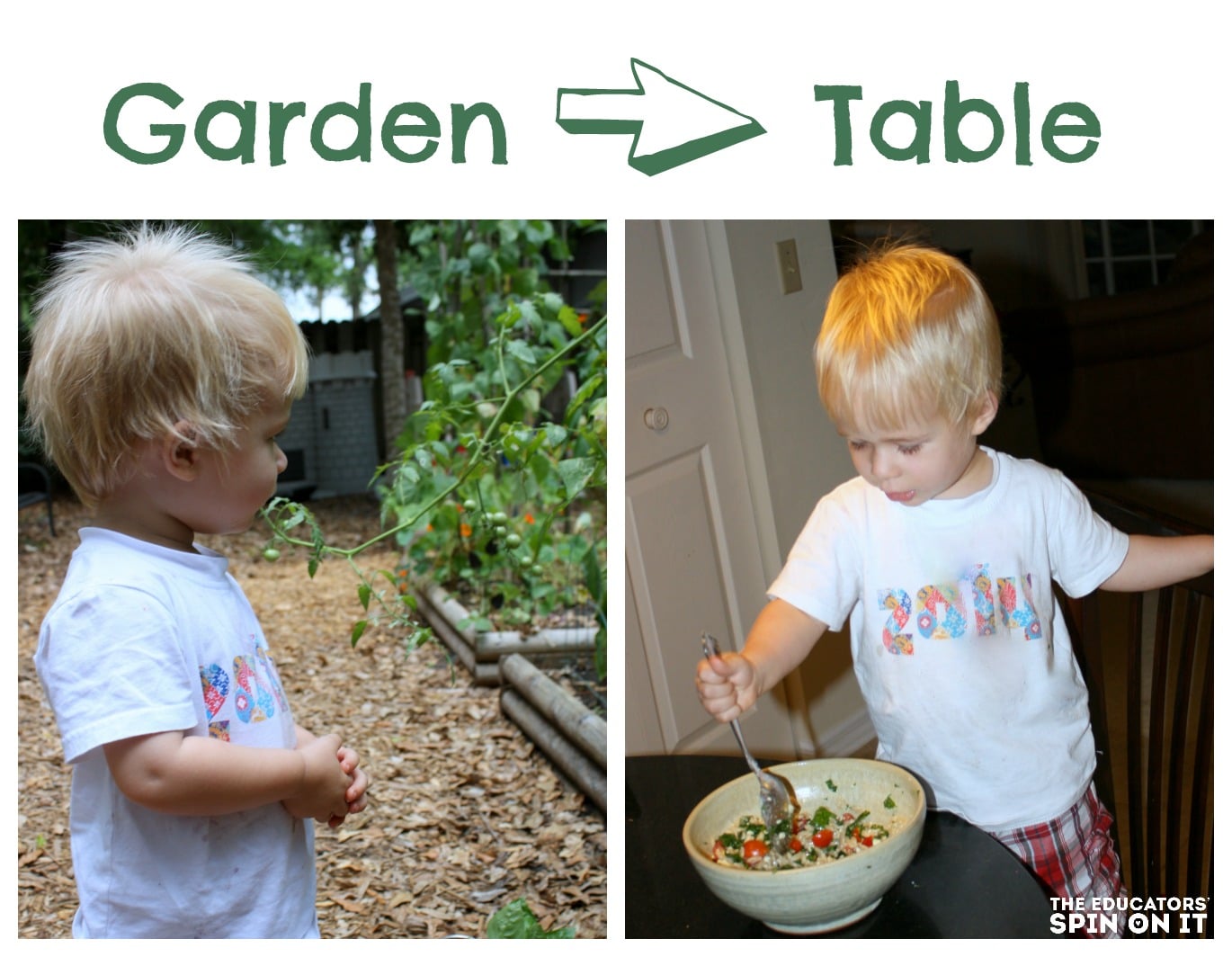 (I sent the little guy to get all the veggies, since he likes to take all the “balls” off the tomato plants no matter what color they are. Back inside he helped wash everything in the sink and also insisted upon “cooking” too! He added the vegetables, stirred, and mixed it all up! We call it Garden to Table)