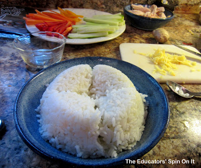 I thought this would be a great way to get the kids in the kitchen cooking AND another way to offer healthy vegetables. The book, “A Cook’s Journey to Japan,” by Sarah Marx Feldner provided us with a guide on how to make Sushi Rice, the ingredients needed, and the directions on how to make them!