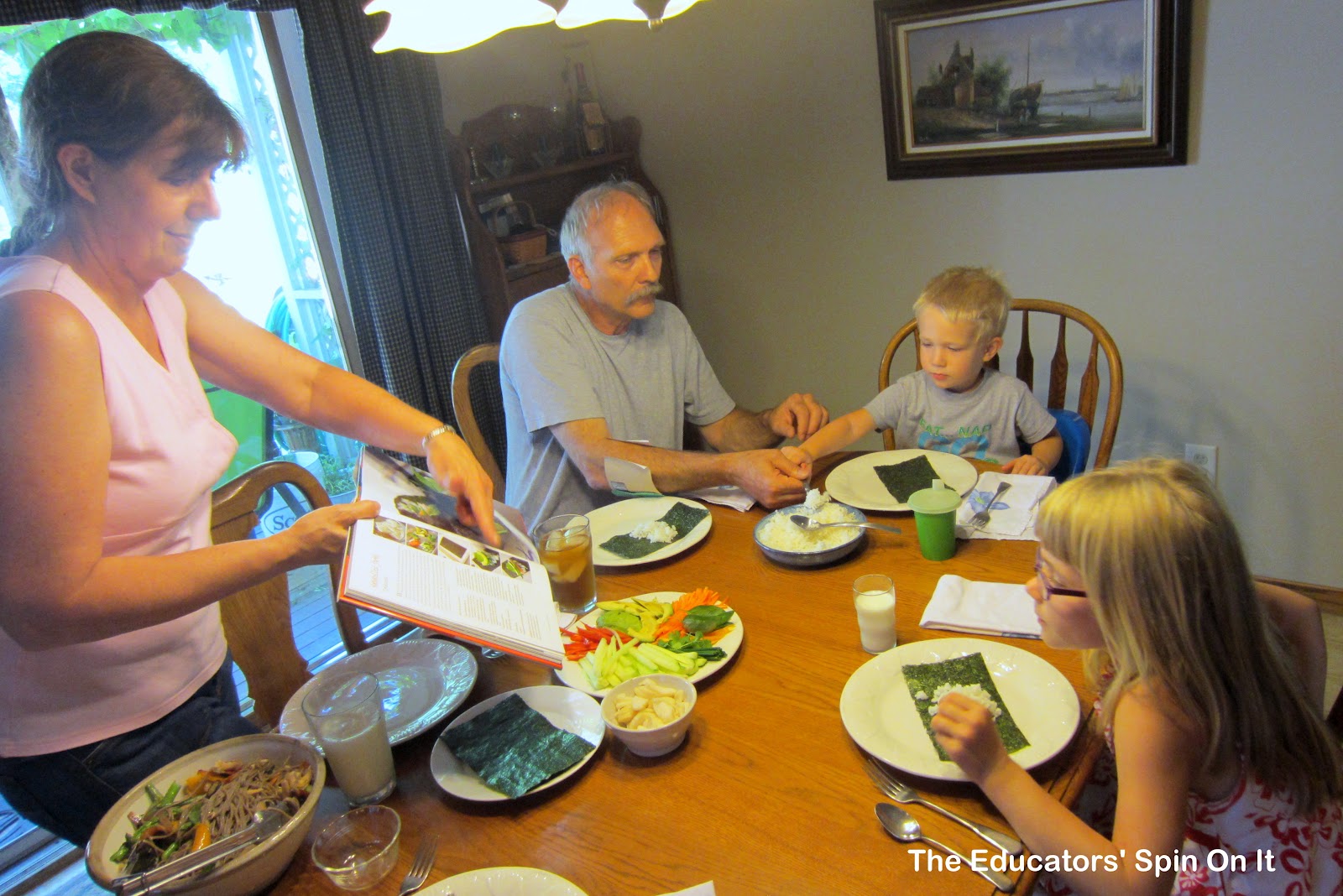 We brought out our book to show the kids the connection between what we were making and the cookbook. (The kids also went to the library with us to pick out a stack of Japanese Cookbooks.) My mom read through the steps and we followed her, well, Sarah’s instructions.