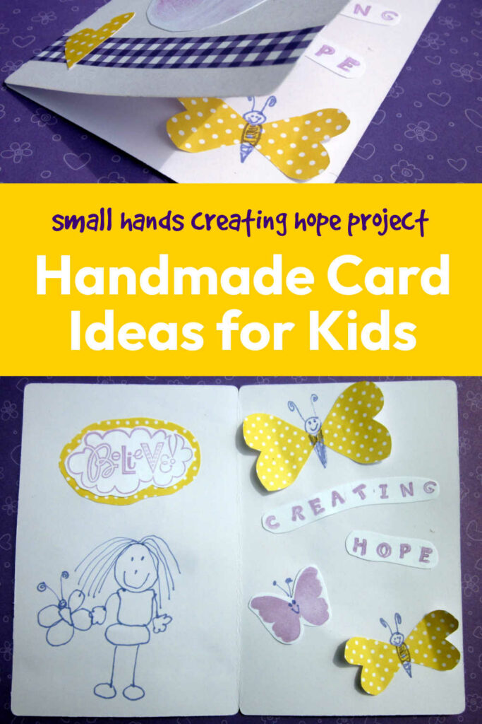 Both of my children created this special greeting card for the Small Hands Creating Hope project. This is an idea of a card that you can easily create for a loved one who’s going through cancer treatment or for patients staying at the Hope Lodge. A full tutorial for our Greeting Card Project is included in the Small Hands Creating Hope Book.