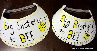 For a little extra special bonus, I made these little visors (1$ each from JoAnnes and fabric paint from my stash) for the kids the night before and left them on the table the morning of the party. My 2 year old wore his all day! Although the custom-made big brother and big sister t-shirts are something I have been eyeing and oogling over for a while, these were in my budget!!!