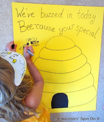 My five year old wasn’t extremely interested in the visor (like her little brother), but really liked the sign, “We buzzed in today bee-cause you are special.” During the party, we had everyone at the party add a bee and their names to the poster! I am excited about this one too because all of our friends have signed the poster – making it a cute keepsake for taking with me to the hospital on baby’s birthday!!!