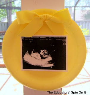 A copy of the ultrasound glued to a paper plate, topped with a bow and YES, done by my 5 year old! Don’t you like easy, budget-friendly decorations that can also be used as keepsakes? I know I do!