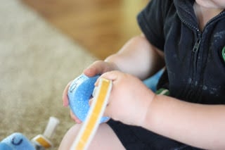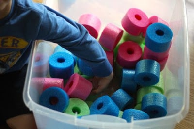 Encourage your toddler to practice threading large pool noodle beads with this fine motor activity.