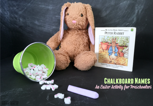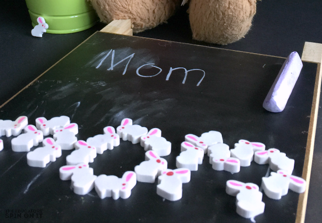 TIP: Younger children might need a little extra help by writing the name first and then the child copies their name onto the chalkboard. We use this mini chalkboard/dry erase board for projects like this. Another way to help them along is to write a list of family names that they can copy the letters and play this Easter Themed game with rabbits.