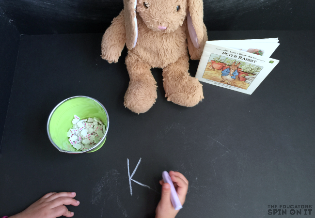 Having a special friend that helps you with writing can sometimes help little ones to be encouraged to keep at it a little bit longer. This activity was created to help foster that connection. Search around the house to find a special bunny to join the fun or grab a new stuffed Peter Rabbit online.